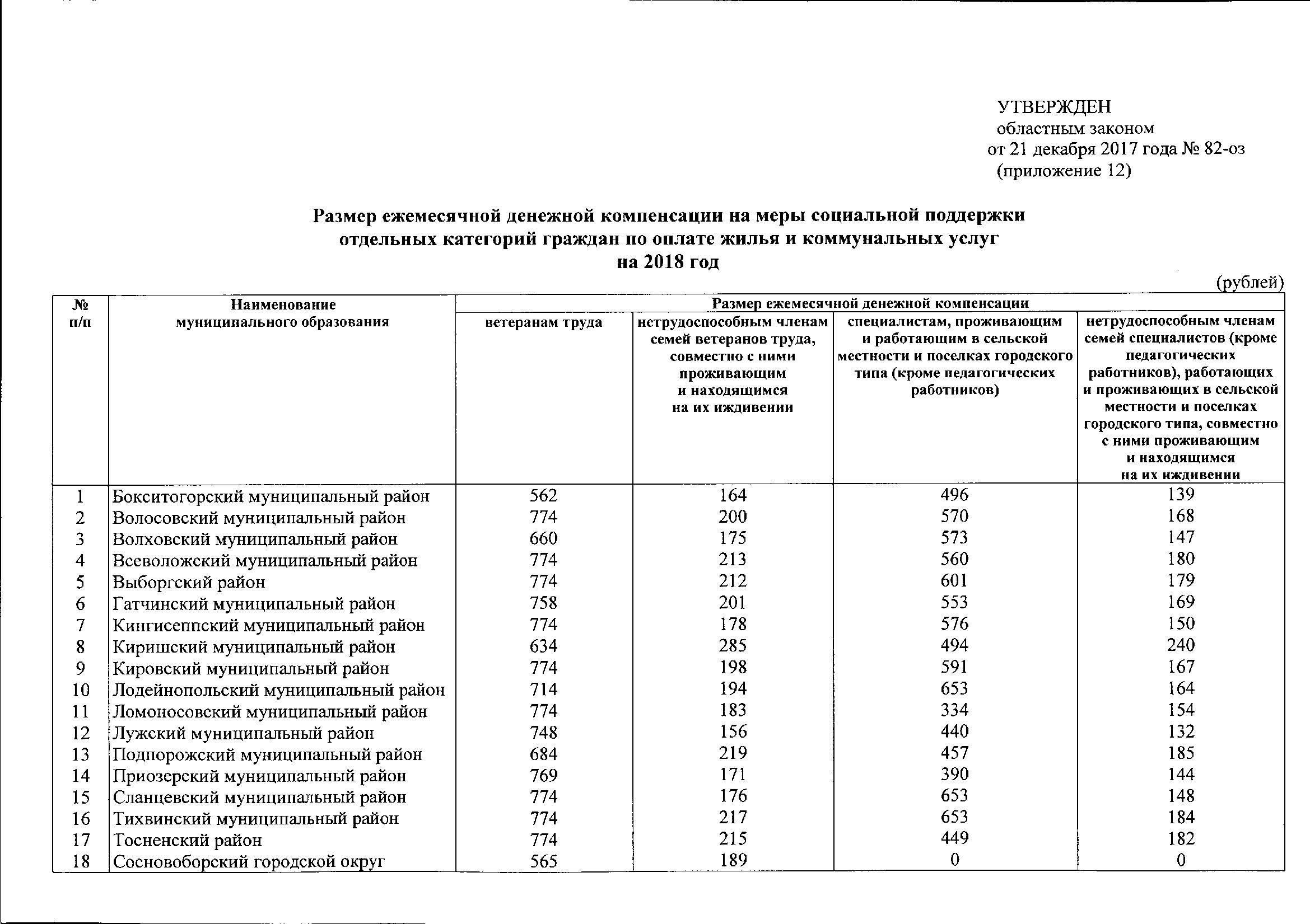- Размеры мер социальной поддержки (социальных выплат) выплат, установленные с 1 января 2018 года статьей 6 Областного закона от 21 декабря 2017 года № 82-оз «Об областном бюджете Ленинградской области на 2018 год и на плановый период 2019 и 2020 годов» приведены в таблице > > >